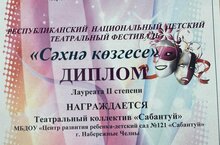 В Городском дворце творчества детей и молодежи №1 состоялся Республиканский детский национальный театральный фестиваль «Сәхнә көзгесе». Особенностью Фестиваля является приобщение детей к театральному искусству через организацию выступлений детских театральных коллективов и отдельных участников - чтецов. Воспитанники нашего детского сада участвовали в номинации "Театр" удостоилась звания лауреата 2 степени. От всей души поздравляем наших воспитанников! Желаем им дальнейших творческих побед!!!