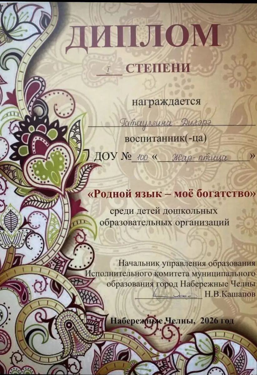 Талантливый воспитанник подготовительной группы №10 Ахметов Ильяс набрал наибольший балл в межрегиональном конкурсе "Минем балам татарча сэйлэшэ" среди 73 участников из Республики Татарстан!