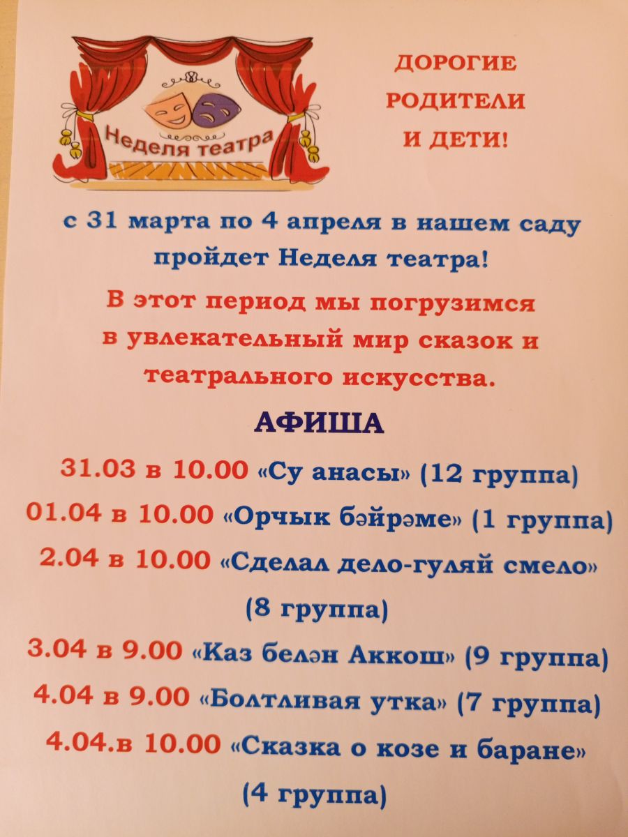С 31 марта по 4 апреля в нашем детском саду пройдёт неделя театра!