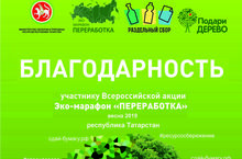 За активное участие во Всероссийской акции "Эко-марафон "Переработка" МАДОУ "Детский сад №104 "Бэлэкэч" наградили благодарственным письмом с присвоением звания "Экогерой"!