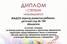 Детский сад №104 "Бэлэкэч" занял 1 место в городском конкурсе по благоустройству, озеленению и цветочному оформлению территории города Набережные Челны в номинации "Лучшее цветочное оформление входной группы" в категории "Муниципальные учреждения". Большое спасибо всем работникам ДОУ и родителям за оказанный вклад!