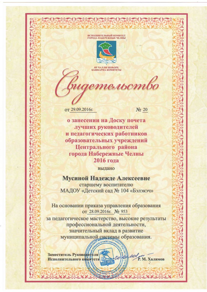 Поздравляем, старшего воспитателя, Мусину Надежду Алексеевну, с занесением на Доску почета лучших руководителей и педагогических работников образовательных учреждений города Набережные Челны 2016 года! Желаем творческих успехов!
