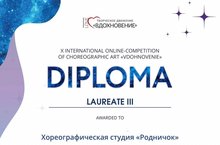 Хореографическая студия «Родничок», руководитель Ткачук Ю. В., приняла участие в международном-онлайн конкурсе «Вдохновение» с танцем «Любит не любит». Получили диплом за 3 место. Молодцы!