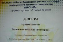 Поздравляем вокальный ансамбль " Виктория", руководитель Юкина Л. И.! Ребята приняли участие в республиканском фестивале - конкурсе современного вокального творчества "Прорыв" в рамках проекта " В ритме жизни" и стали лауреатами 1, 2 и 3 степени. Молодцы!