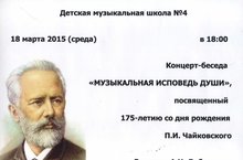 18 марта в 18 часов в ДМШ № 4 состоится концерт - беседа "Музыкальная исповедь души",посвященный 175 -летию со дня рождения П.И.Чайковского. Приглашаются Все желающие.