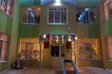 Входную дверь и окна в здание детского сада украсили сверкающими новогодними гирляндами. На окнах из вытынанок изображены удивительные сказочные персонажи.