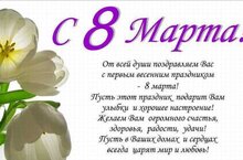Дорогие женщины, поздравляем вас с 8 Марта! Вы — великолепный, очаровательный венец творения природы! Восхищаться вашей красотой, добротой, умом, талантами и отдачей можно веками! Будьте счастливы во всех сферах жизни: и дома, и на работе, и, занимаясь любимым делом. Здоровья вам и вечной молодости!