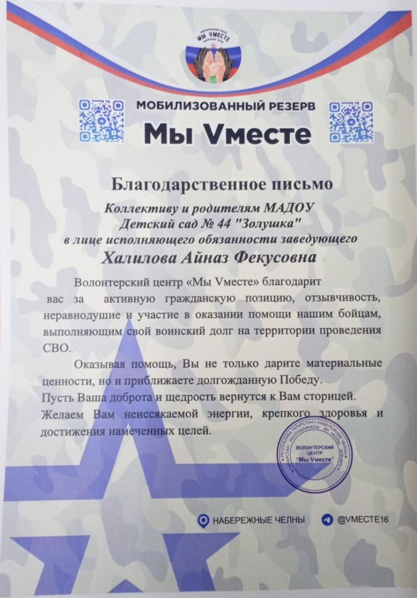 Опубликовано: 05.05.2025В нашем детском саду прошла акция по сбору гуманитарной помощи участникам СВО. Основная цель акции — выразить поддержку российским военным, участвующим в спецоперации, и показать единство граждан. В такой непростой период, главное для жителей всей нашей страны быть единым и сплоченным народом, быть вместе, не бросать своих соотечественников и наших военнослужащих, которые каждый день демонстрируют героизм и силу.