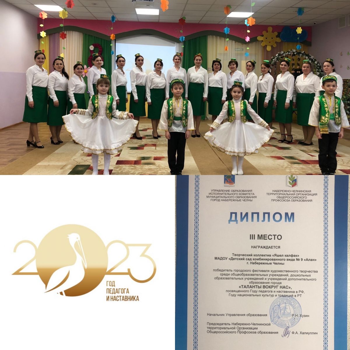 Творческий коллектив «Яшел калфак» детского сада №9 «Алан» награжден дипломом 3 степени в городском фестивале художественного творчества среди общеобразовательных учреждений, дошкольных образовательных учреждений и учреждений дополнительного образования города «Таланты вокруг нас» посвященному Году педагога и наставника в РФ, году национальных культур и традиций в РТ.