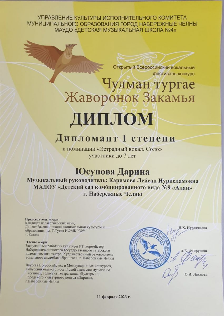 Воспитанница 2 группы Юсупова Дарина приняла участие в открытом Всероссийском вокальном фестивале-конкурсе Чулман Тургае "Жаворонок Закамья" в номинации "Эстрадный вокал.Соло" с исполнением песни "Мамочка моя". Наша звездочка, дипломант 1 степени, награждена диплом