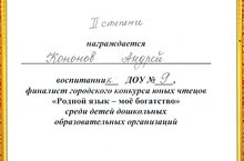 Воспитанник нашего детского сада награжден Дипломом II степени в городском конкурсе юных чтецов "Родной язык-мое богатство" среди детей дошкольных образовательных организаций. Поздравляем с победой!!!
