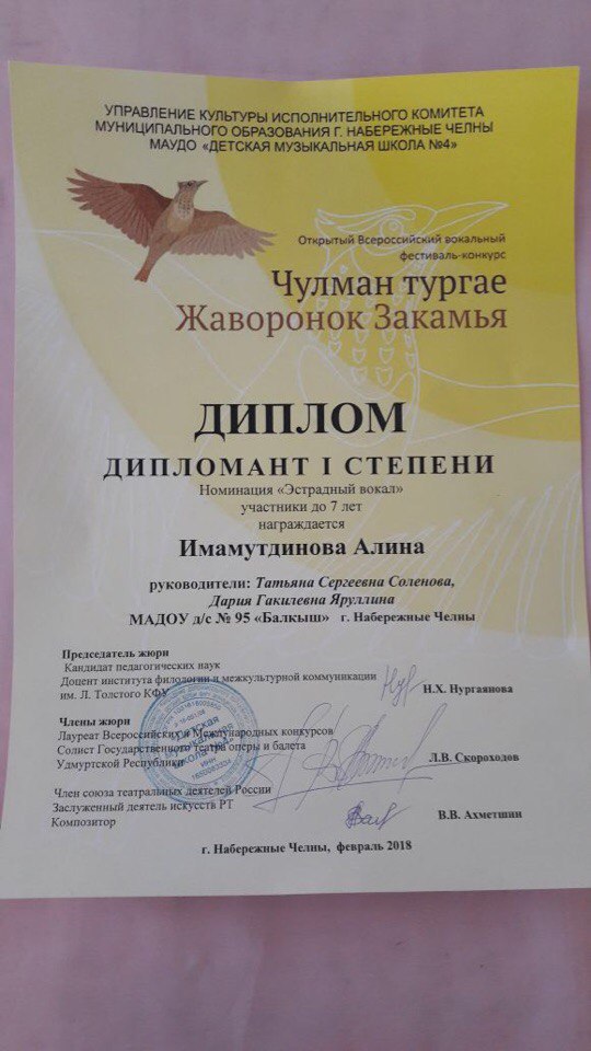 Поздравляем воспитанницу 3 группы "Почемучки", ИМАМУТДИНОВУ АЛИНУ со званием ДИПЛОМАНТА I СТЕПЕНИ в номинации "Вокал-соло". Так держать! ФОТО 1 ФОТО 2