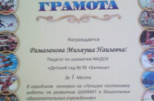 Подведены итоги городского конкурса на «Лучшую постановку работы по развитию ШАХМАТ в ДОУ». Работа Балкыш в данном направлении оценена высоко. Руководитель шахматной студии Рамазанова Миляуша Наилевна заняла I место в номинации «За формирование устойчивого интереса на занятиях по шахматам». Её воспитанники Ильина Снежана заняла III место в городском турнире, Фатхутдинов Шамиль выполнил III юношеский разряд.