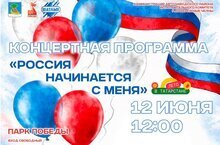 Приглашаем Вас на праздничную программу «Россия начинается с меня!» в честь празднования Дня России, 12 июня в 12.00ч. в парке Победы. В программе мероприятия: концертная программа, работа игровых площадок для детей.