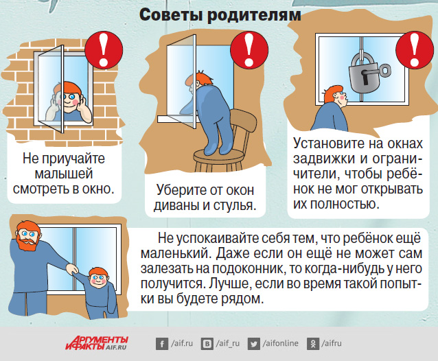 · Никогда не рассчитывайте на москитные сетки! Они не предназначены для защиты от падений. Напротив - москитная сетка способствует трагедии, ибо ребенок чувствует себя за ней в безопасности и опирается как, на окно, так и на нее. Очень часто дети выпадают вместе с этими сетками.