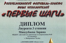 27 января в нашем городе состоялся традиционный Республиканский фестиваль-конкурс юных исполнителей «Первые шаги». Поздравляем нашу звездочку Миндубаеву Зарину и музыкальных руководителей Грудилову Марину Сергеевну и Ватлину Надежду Ивановну с блестящим выступлением и дипломом лауреата 3 степени!