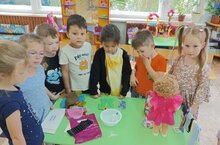 В 8 группе у ребят прошло занятие с воспитателем Татьяной Владимировной по ознакомлению с окружающим миром на тему: «Наряды куклы Тани». Цели и задачи занятия - познакомить детей с разными видами тканей и их свойствами, научить устанавливать связь между материалом и назначением предметов одежды. В гости к ребятам пришла кукла Таня со своими нарядами. Дети выяснили, что существует разная одежда, зачем и когда ее люди носят в зависимости от времён года, рассмотрели образцы тканей, вспомнили из чего делают ткань, что делают из разной ткани, изучили нити ткани, провели опыты с водой на промокаемость. В заключение занятия дети нарядили нашу куклу на прогулку.