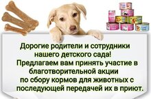 Мы решили в нашем детском саду провести благотворительную акцию по сбору кормов хвостатым питомцам приюта для животных. Мы очень рады, что родители воспитанников охотно поддержали нашу идею. Целью акции является формирование гуманной культуры воспитанников на основе духовно-нравственного развития личности через совместную деятельность дошкольников и родителей.