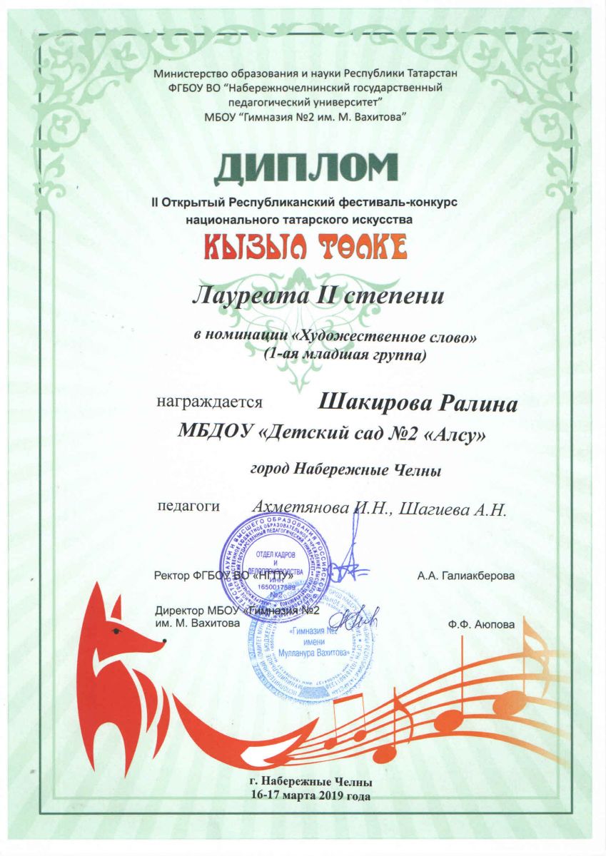16 и 17 марта в нашем городе  проводился II Открытый Республиканский фестиваль - конкурс национального татарского искусства «Кызыл төлке».  Цель конкурса:  нравственно-эстетическое воспитание подрастающего поколения посредством народного творчества и сохранение традиций национальной культуры Татарстана. Воспитанники ДОУ участвовали в номинациях «Художественное слово» и «Вокал» и заняли призовые места. Поздравляем юных артистов с победой!!!