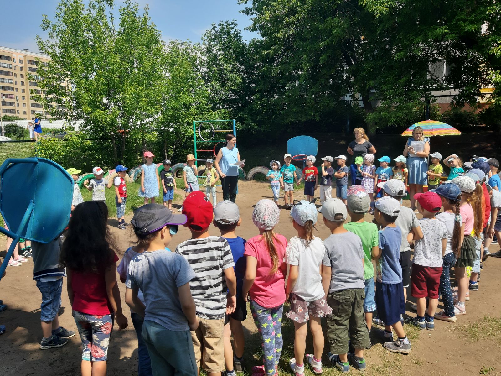 Сюжетом квеста «По тропинкам нашей Родины» являлись задания, которые дети выполняли на площадках. Маршрут следования, обозначенный в форме ребуса или загадки дети получали выполнив задание на площадке. Во время продвижения к следующей цели (тематической площадке) дети останавливались и показывали флешмоб ,демонстрируя сплоченность, организованность, командный дух (флешмоб — от англ. flash mob— flash— вспышка; миг, мгновение; mob— толпа; переводится как «мгновенная толпа«— это заранее спланированная акция, в которой группа людей в общественном месте выполняет заранее оговоренные действия) .