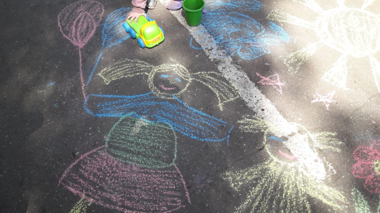 Праздник продолжился рисованием на асфальте цветными мелками. Все рисунки были разными, но объедены одной общей темой «Счастливое детство»