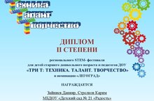 Объявлены результаты регионального STEМ-фестиваля для детей дошкольного возраста «Три Т: Техника. Талант. Творчество». Наши воспитанники Зайниев Данияр и Стрелков Карим заняли 2 место в номинации «Инженерики». Поздравляем победителей!