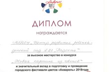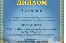 Поздравляем коллектив МБДОУ№21 "Радость" с Дипломом 3 степени в конкурсе по благоустройству, озеленению и цветочному оформлению Автозаводского района. Особая благодарность родителям и воспитателям 5 и 10 группы. Молодцы! 20.08.2018
