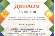ПОЗДРАВЛЯЕМ КОЛЛЕКТИВ ДОУ №21 С ДИПЛОМОМ 1 СТЕПЕНИ в конкурсе по благоустройству территории от Автозаводского района 23.08.2017