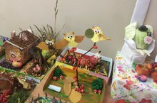 Экспозиция «Эко осень» в этом году посвящена любимым сказкам. Собрав природный материал, а так же кусочки картона, стаканчики и другой пластиковый мусор наши воспитанники со своими родителями создали целый сказочный мир, где Золушка спешит на бал, мудрая сова учит Винни Пуха хорошим манерам, поросята строят на зиму дом и еще много разных героев. В выставке приняли участие все группы без исключения и каждая работа была удостоена номинации, все участники получили дипломы ДОУ