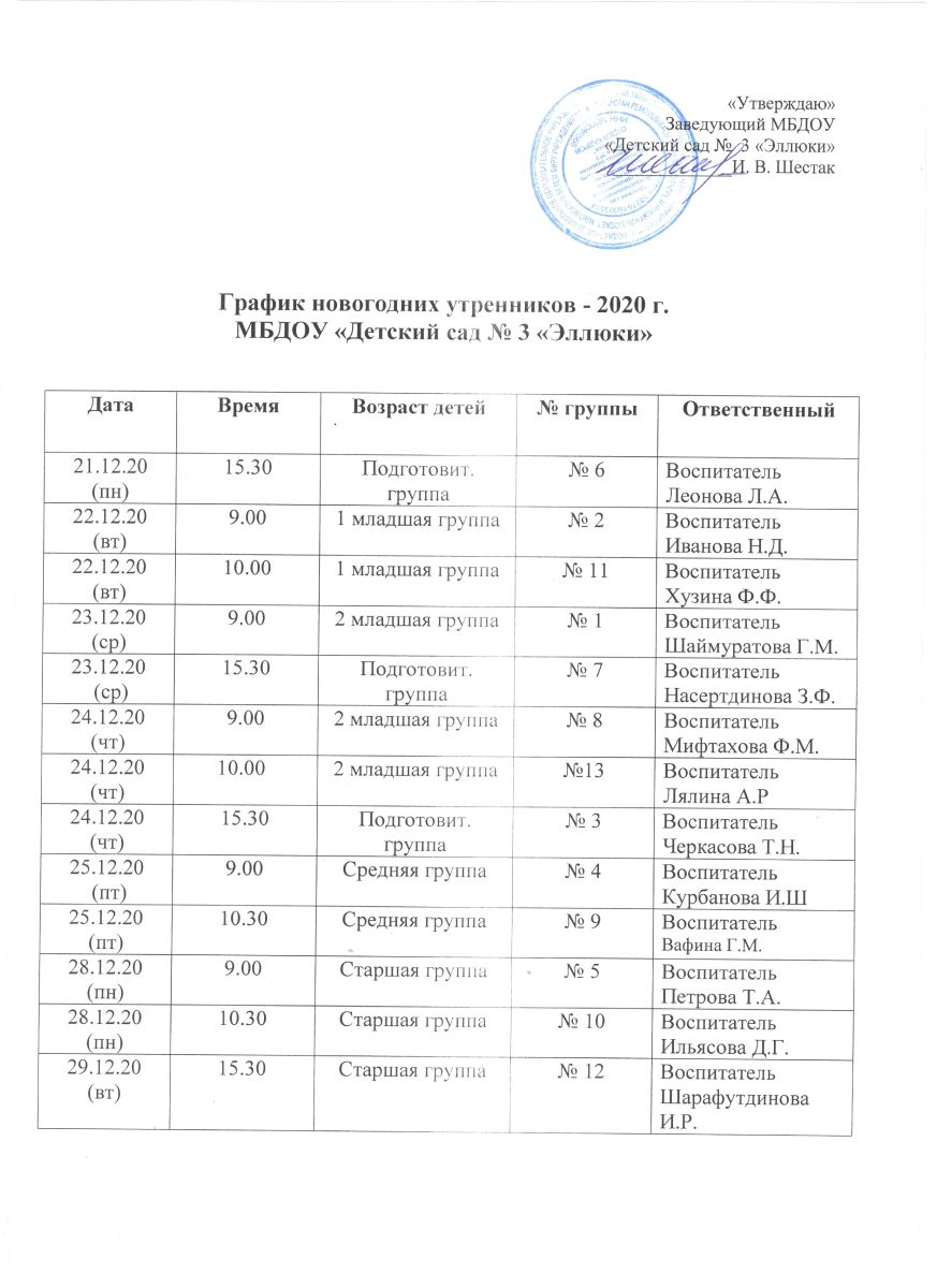 ГРАФИК НОВОГОДНИХ УТРЕННИКОВ 02.12.2020