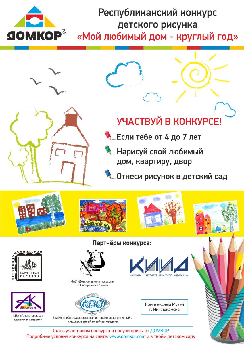 Опубликовано: 09.09.2016С 10 сентября стартует республиканский конкурс детского рисунка «Мой любимый дом круглый год», организованный ООО «ДОМКОР» (г. Набережные Челны).