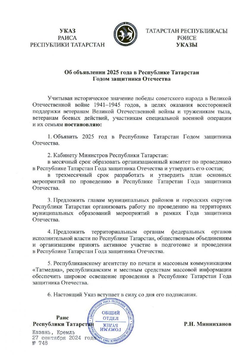 Указ Раиса Республики Татарстан "2025 год в Республике Татарстан обьявлен Годом защитника Отечества".jpg