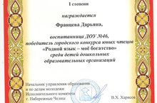 Поздравляем с победой Францеву Дарьяну в городском конкурсе юных чтецов "Родной язык-мое богатство".