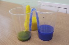 В два стакана педагог налила воду и добавила в нее пищевой краситель ( в один стакан – желтый, в другой – синий, а третий стакан оставила пустым.