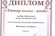 21 апреля 2016 года в г.Набережные Челны прошло мероприятие "Татар малае, татар кызы-2016". Наша воспитанница, Иксанова Самира, была ведущей данного конкурса и заняла 3 место по Автозаводскому району в конкурсе "Татар кызы - 2016". Поздравляем и желаем в дальнейшем успехов и побед!