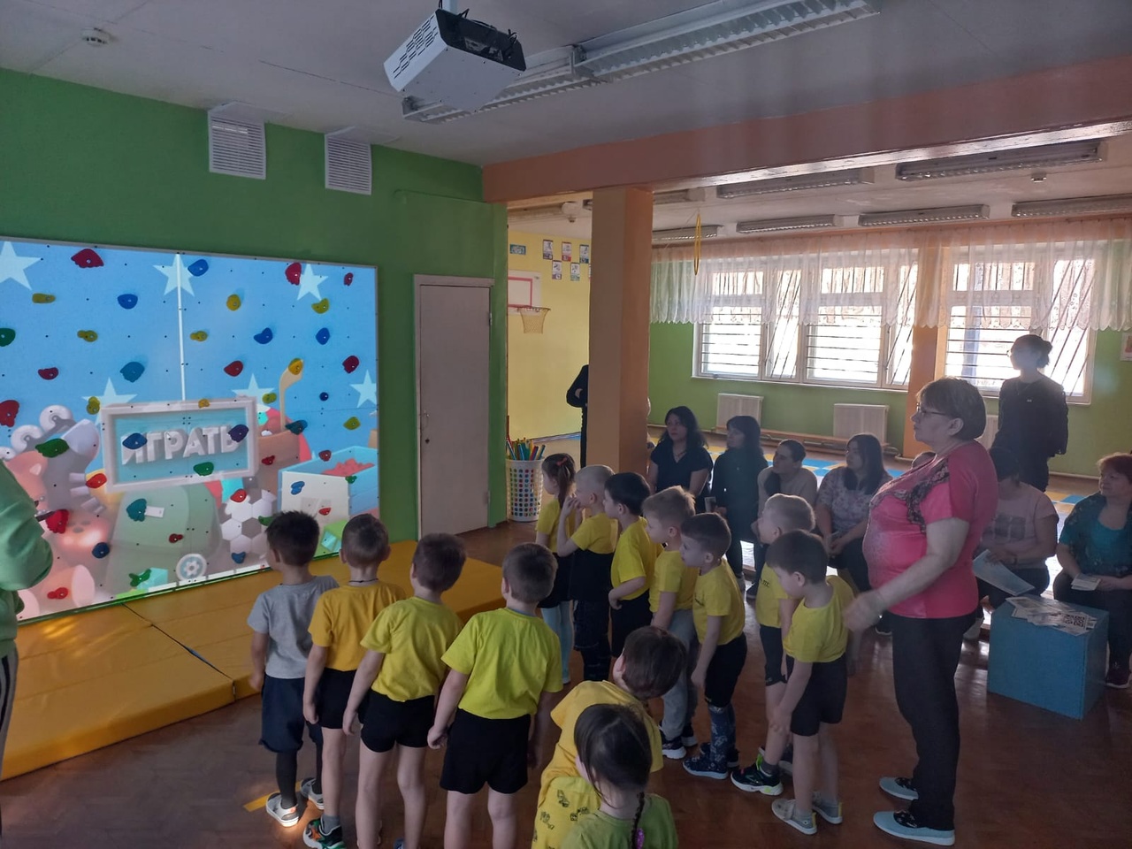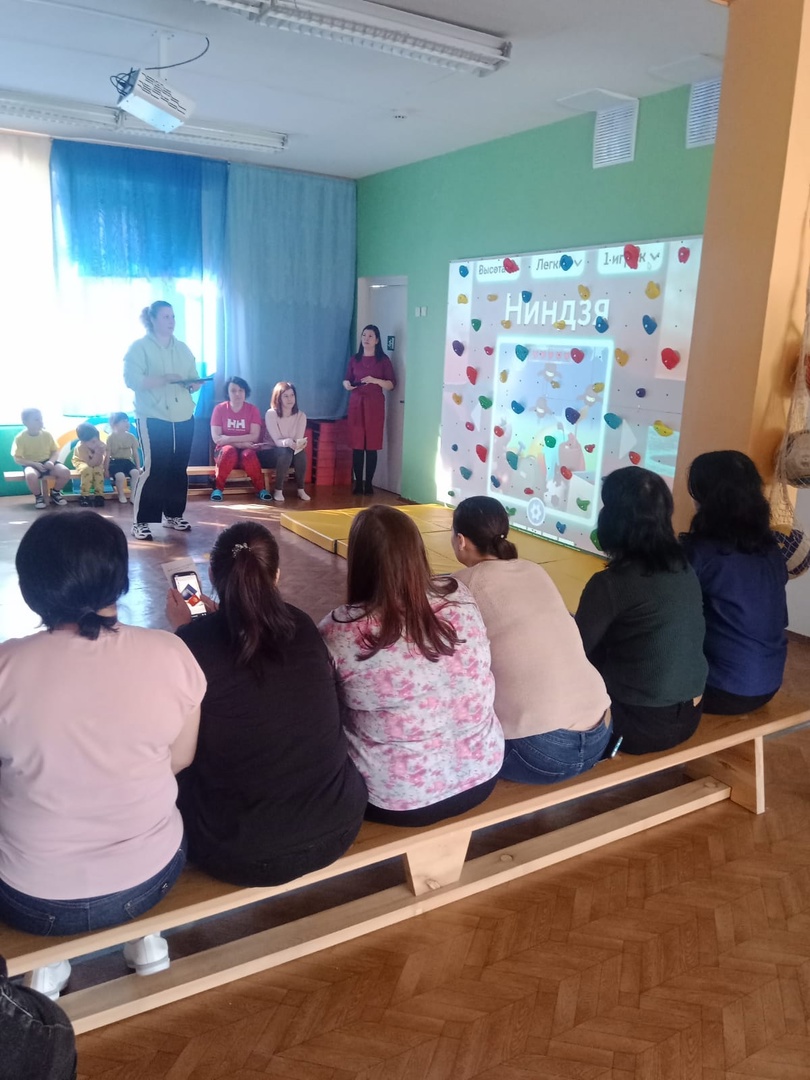 В рамках реализации проекта мультимедийный физкультурный комплекс "Интерактивный скалодром", приобретенного при поддержке БФ "Татнефть" сегодня вновь встречаем дорогих гостей- родителей наших воспитанников на открытом занятии по физической культуре. Физинструктор презентует инновационное оборудование - "Интерактивный скалодром".