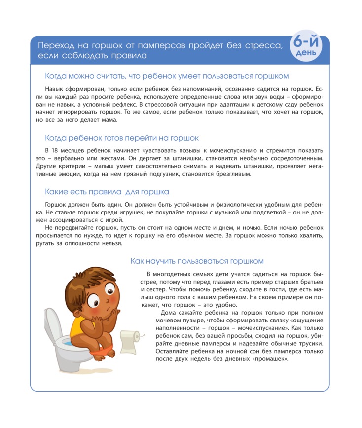 Дома сажайте ребенка на горшок только при полном мочевом пузыре, чтобы сформировать связку «ощущение наполненности — горшок — мочеиспускание». Как только ребенок сам, без вашей просьбы, сходил на горшок, убирайте дневные памперсы и надевайте обычные трусики. Оставляйте ребенка на ночной сон без памперса только после двух недель без дневных «промашек».