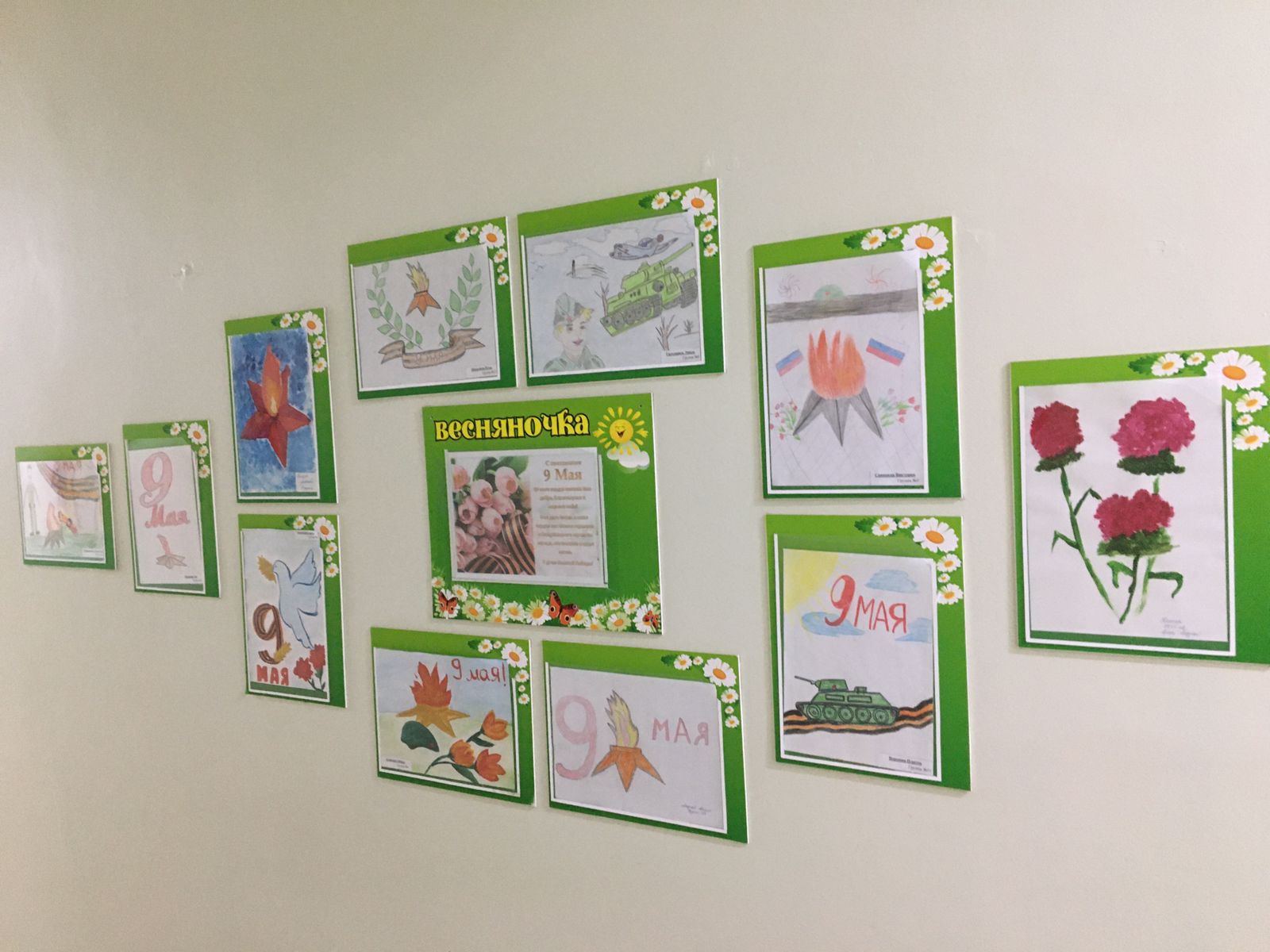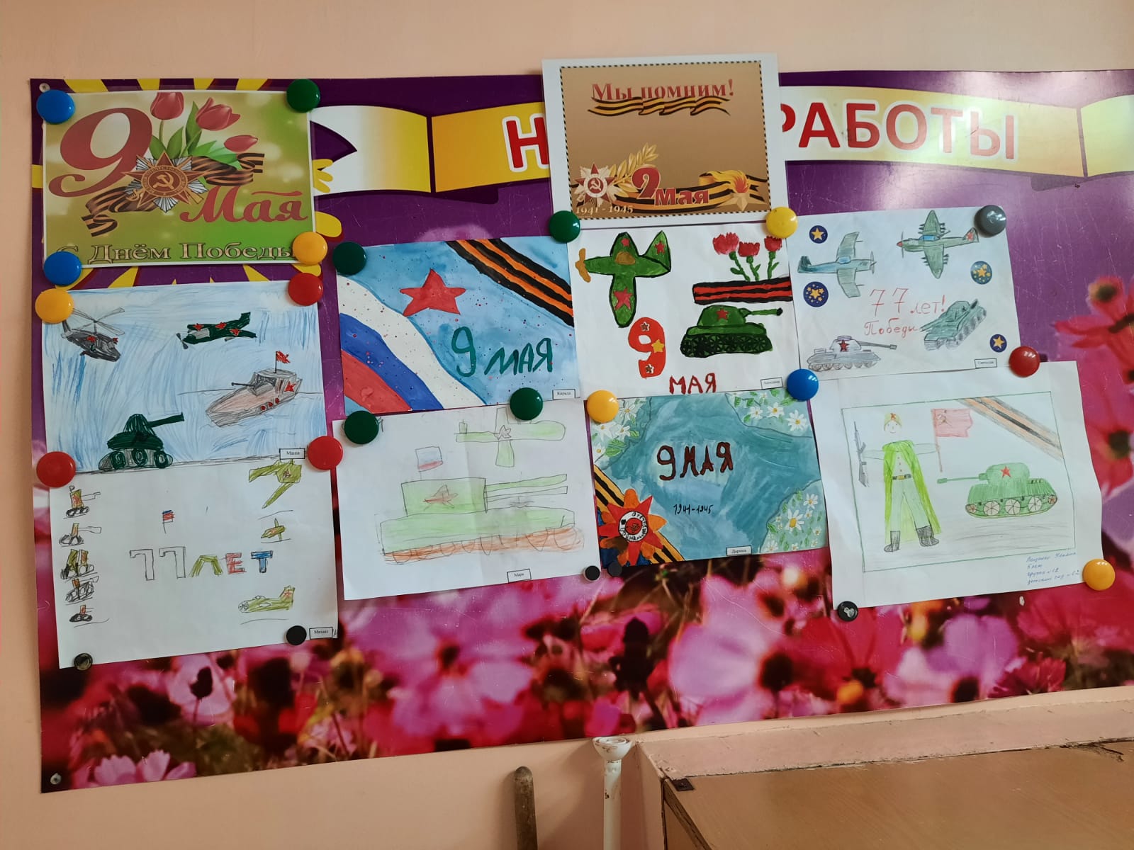 Во всех группах подготовлены выставки детских рисунков, посвященных Дню Победы. Выставка детского рисунка «День Победы» оформлена в холле ДОУ. На выставке представлены работы детей средних, старших, подготовительных к школе групп.