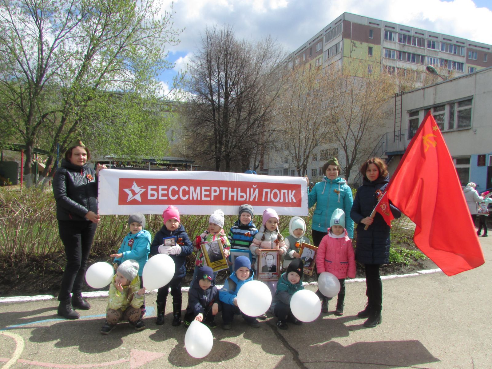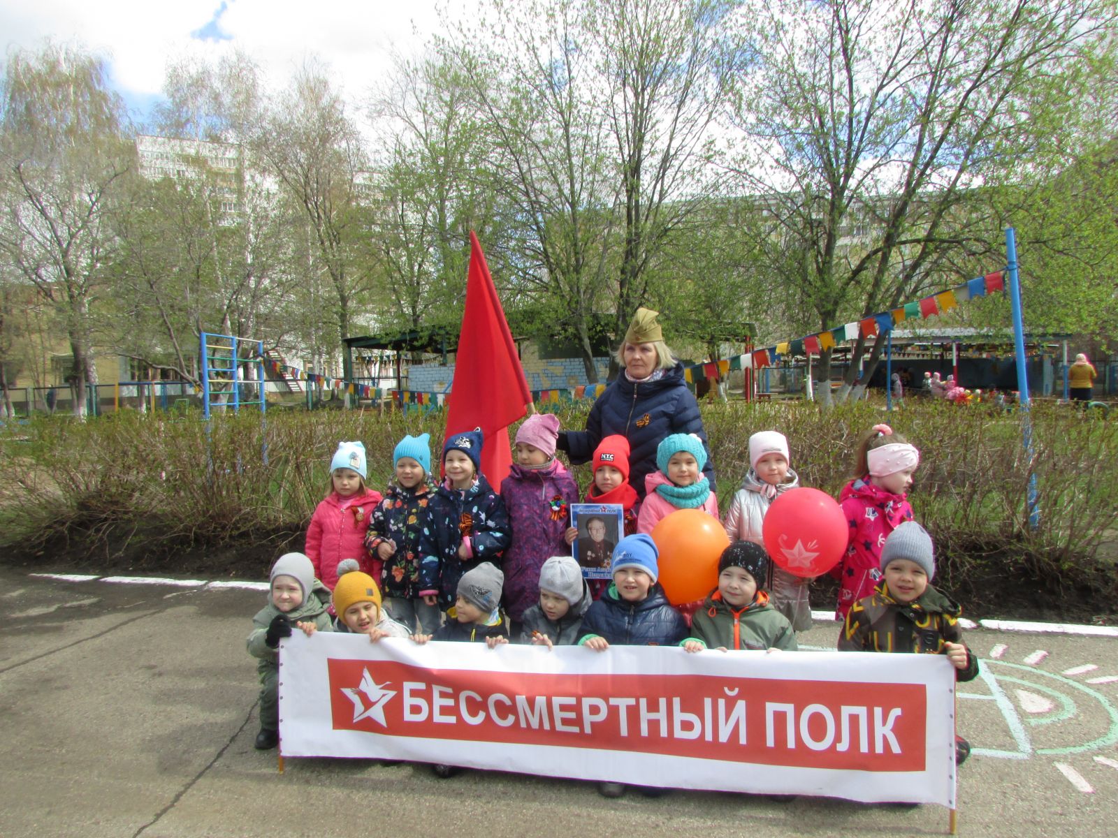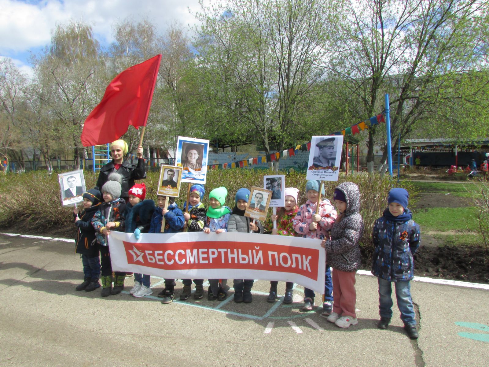 С 2012 года в нашей стране официально существует традиция: люди 9 мая выходят с портретами своих родственников, участвовавших в Великой Отечественной войне, которые не дожили до наших дней, на шествие Бессмертного полка. Сегодня и наш детский сад после двухлетнего перерыва из-за пандемии коронавирусной инфекции проходит в этом полку.