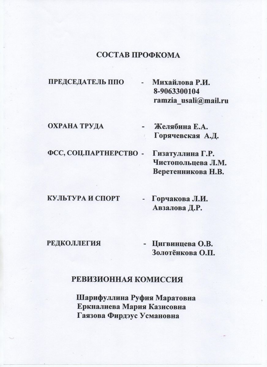 Председатель первичной профсоюзной организации - Михайлова Рамзия Иргашовна, телефон 8 906 330 01 04, электронная почта ramzia_usali@mail.ru