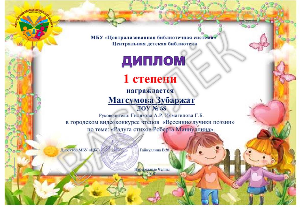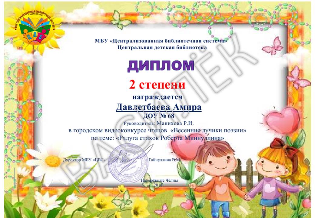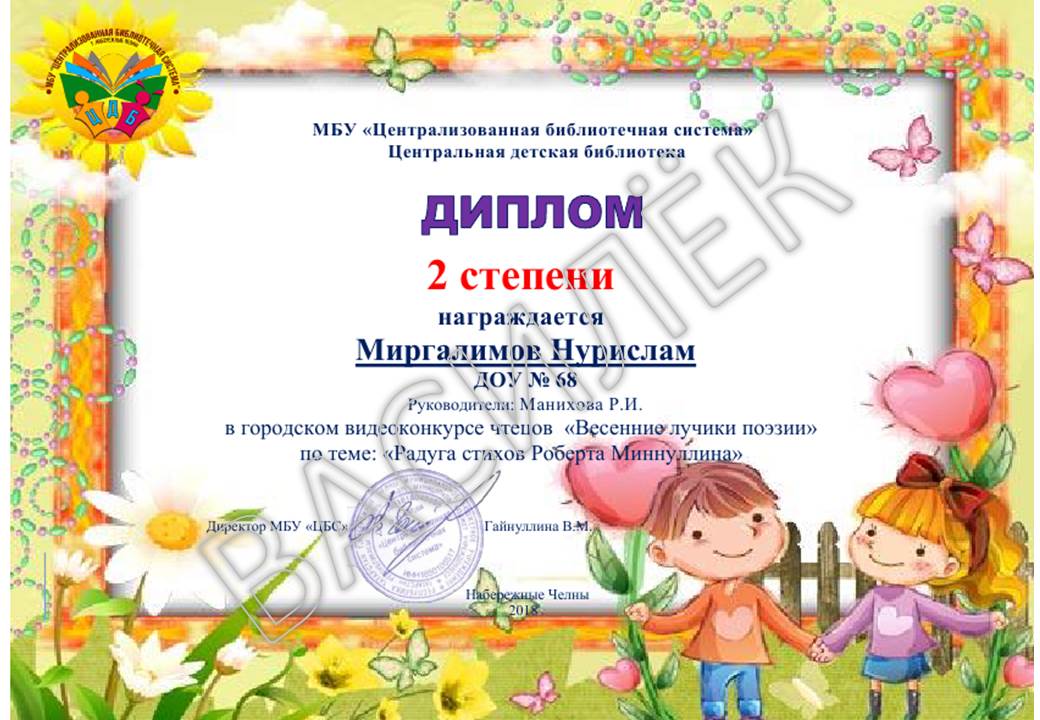 Опубликовано: 04.04.2018Поздравляем дипломантов Магсумова Зубаржат диплом 1 степени, Миргалимов Нурислам диплом 2 степени, Давлетбаева Амира диплом 2 степени, видео конкурса чтецов «Весенние лучики поэзии» по теме «Радуга стихов Роберта Миннуллина» который проходил с 15 февраля по 15 марта в Центральной детской библиотеке . В конкурсе приняли участие 105 воспитанников из 46 дошкольных образовательных учреждений города.