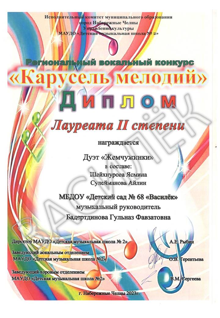 Опубликовано: 29.03.2023 Сегодня на сцене «Детской музыкальной школы №2», соревновались самые юные артисты — воспитанники дошкольных образовательных учреждений от 4 до 7 лет. Более 80 конкурсантов приняли участие в данном конкурсе и покорили зрителей своим талантом в сольных и ансамблевых номерах. В конкурсе, в номинации — эстрадный вокал с песней «Тынычлык җыры» принял участие наш дуэт «Жемчужинки» (Шайхнурова Ясмина, Сулейманова Айлин). Музыкальный руководитель - Бадертдинова Гульназ Фавзатовна.