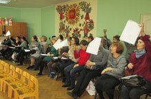 Как дела в дошкольном царстве,В музыкальном государстве?У музруков - свои вопросы:Изучают ФГОСы,Внедряют инновации,И покажут всем пример.Зал, гостей скорей встречай.Громче, музыка, играй! -