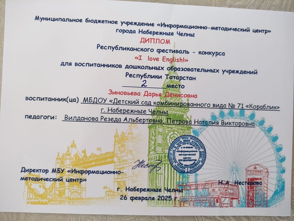 Поздравляем Дашу, воспитанницу группы 10 с удачным выступлением на Республиканском фестивале-конкурсе по английскому языку! Дарья продекламировала стихотворение, ответила на вопросы на английском языке! Благодарим преподавателя, Вилданову Резеду Альбертовну, за подготовку участницы конкурса!