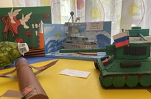 В холле детского сада организована творческая выставка поделок "Военная техника".