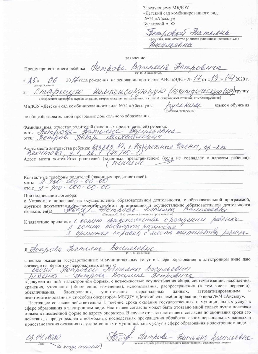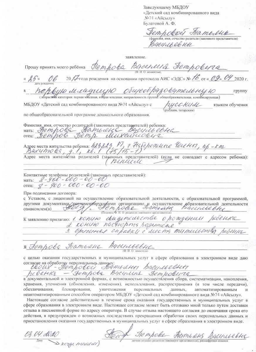 - в нижней части заявления где "даю согласие на обработку персональных данных:" пишем: своих Ф. И. О. полностью, ребёнка Ф. И. О. полностью.