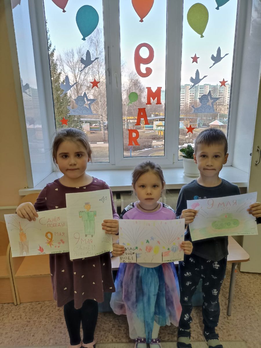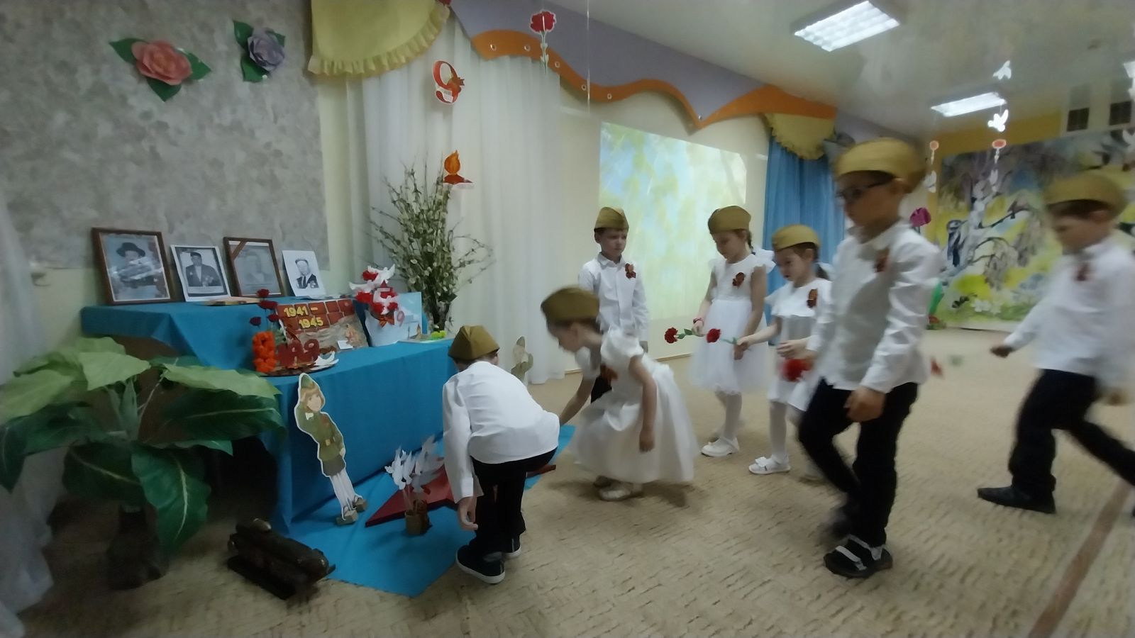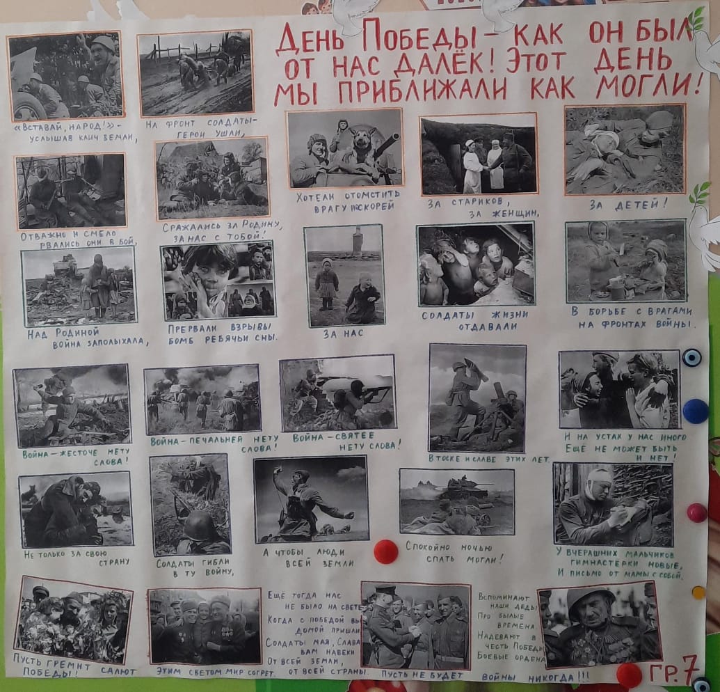 В рамках реализации познавательного проекта " 80 - летие Победы Великой Отечественной Войне"в старшей группе № 7 было проведено итоговое мероприятие " День Победы- как он был от нас далек" Мероприятию предшествовала большая подготовительная работа (приобретение и пошив атрибутов, оформление уголка и окон Победы, рисование тематических рисунков, аппликаций, изготовление поделок,открыток, стенгазеты, коллективной работы с детьми, разучивание военных песен, стихов и танцев, тематические занятия, беседы, чтение рассказов о ВОВ). Родители поддержали наш проект и принимали активное участие.