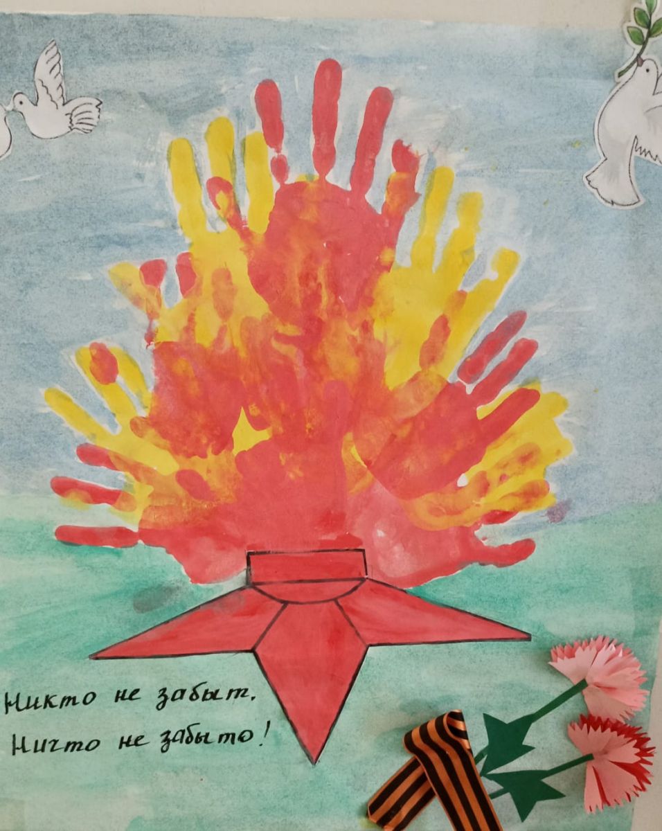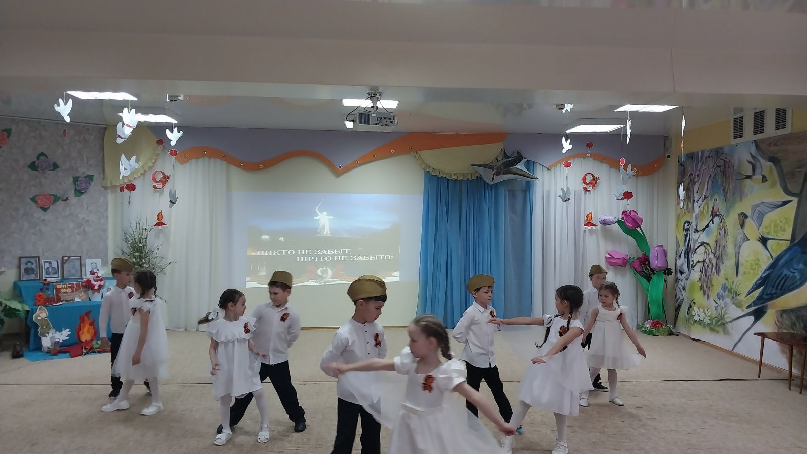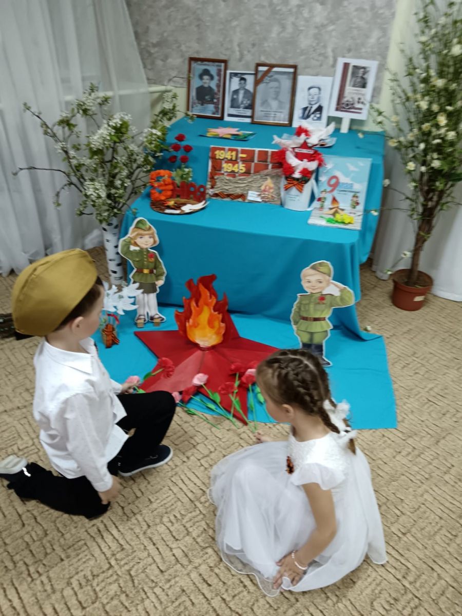 В рамках реализации познавательного проекта " 80 - летие Победы Великой Отечественной Войне"в старшей группе № 7 было проведено итоговое мероприятие " День Победы- как он был от нас далек" Мероприятию предшествовала большая подготовительная работа (приобретение и пошив атрибутов, оформление уголка и окон Победы, рисование тематических рисунков, аппликаций, изготовление поделок,открыток, стенгазеты, коллективной работы с детьми, разучивание военных песен, стихов и танцев, тематические занятия, беседы, чтение рассказов о ВОВ). Родители поддержали наш проект и принимали активное участие.