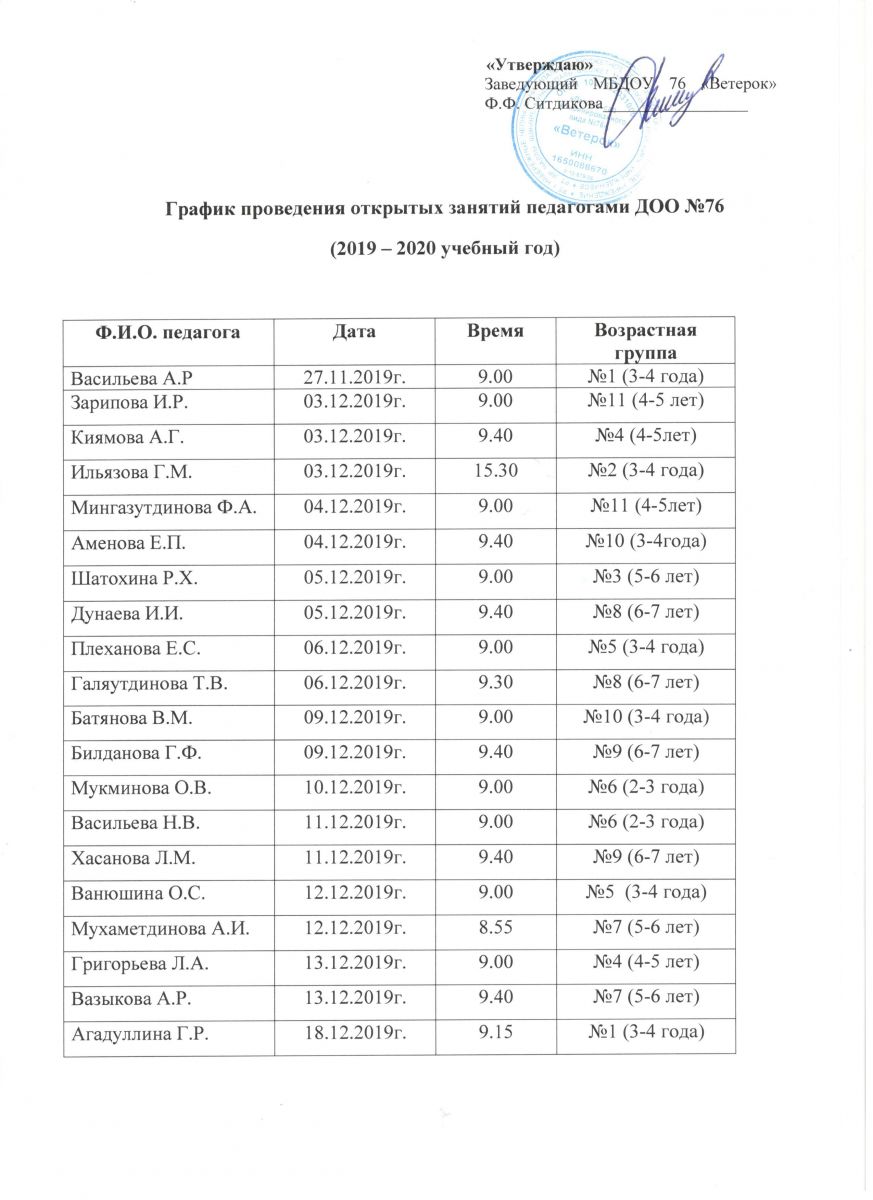 График проведения открытых занятий педагогами ДОО № 76 29.11.2019
