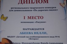 Наша воспитанница Нелли А. заняла первое место в конкурсе "По дорогам сказок" в номинации "Рисунок"
